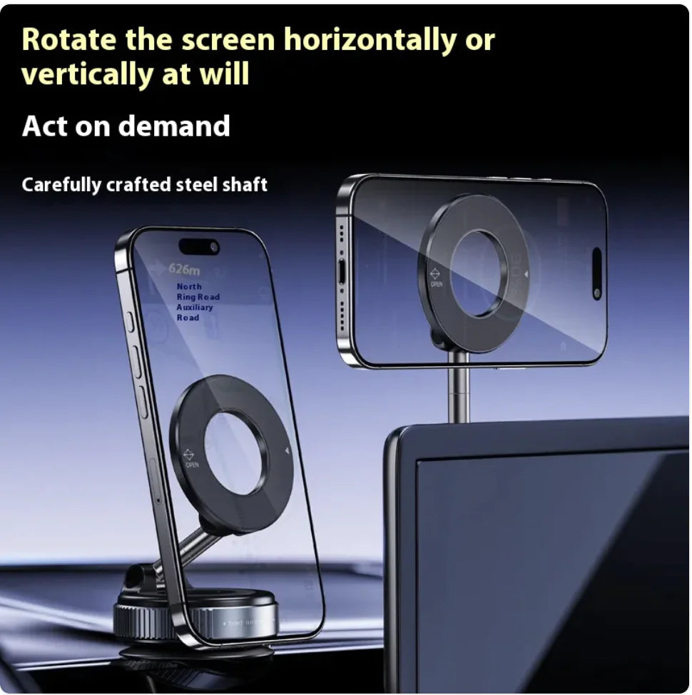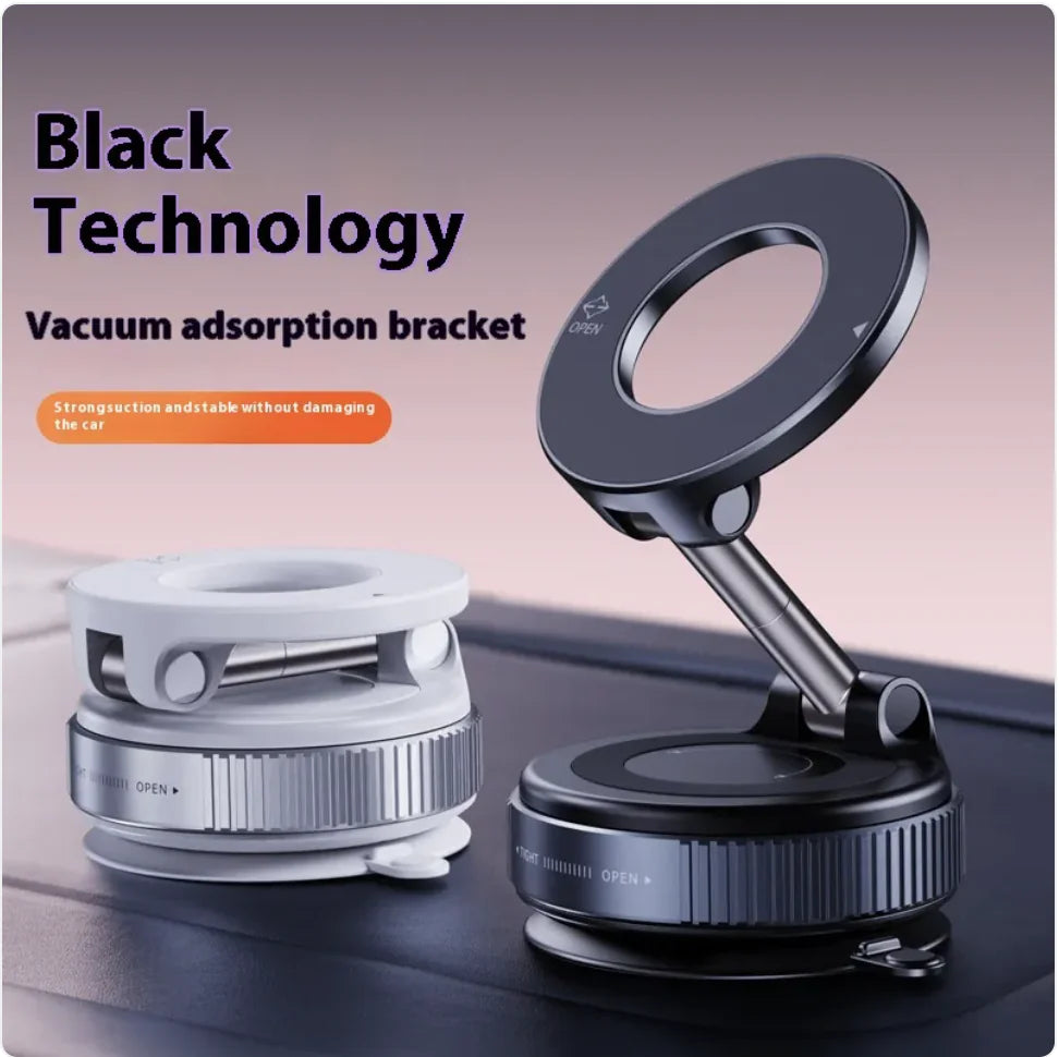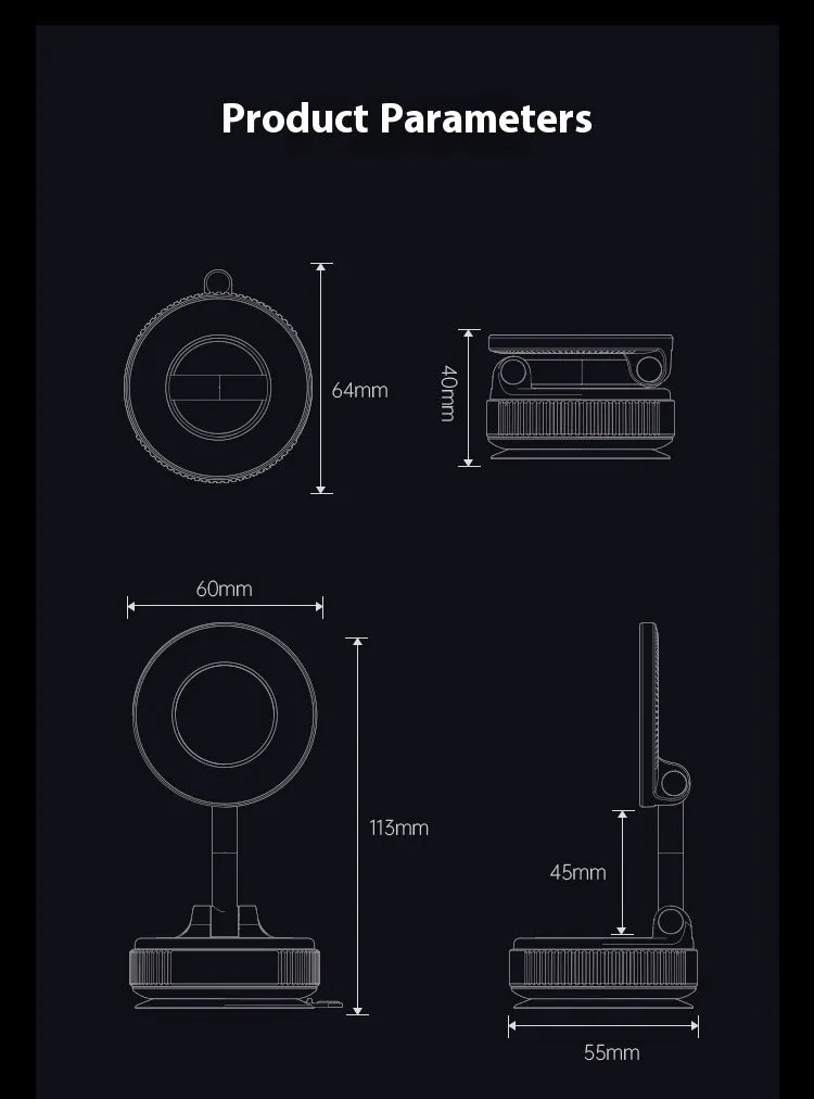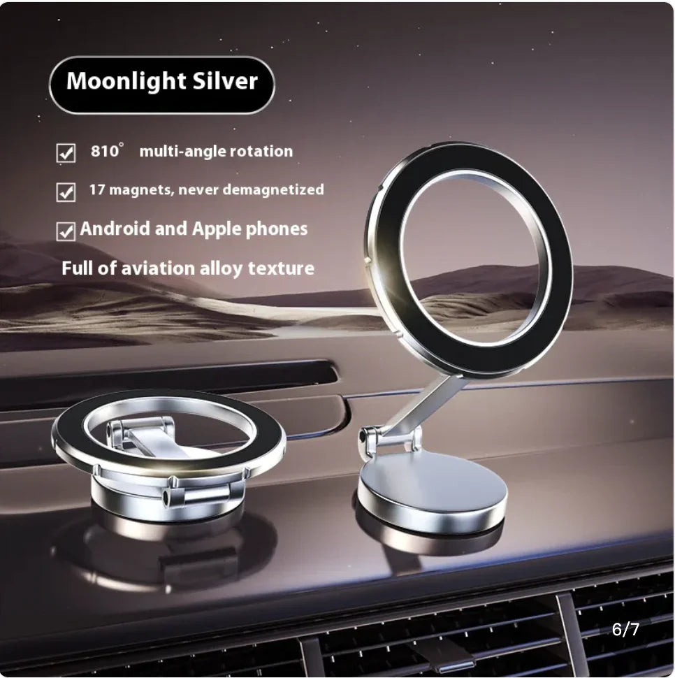 Universal car phone holder for center console navigation. Magnetic, easy to install, available in black and white. Includes bracket, magnetic ring, manual, alcohol pad, and gasket.